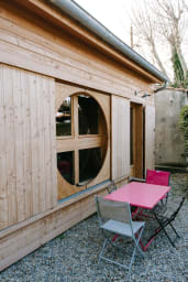 La tiny house est astucieusement agencée, avec une entrée indépendante, garantissant votre intimité.